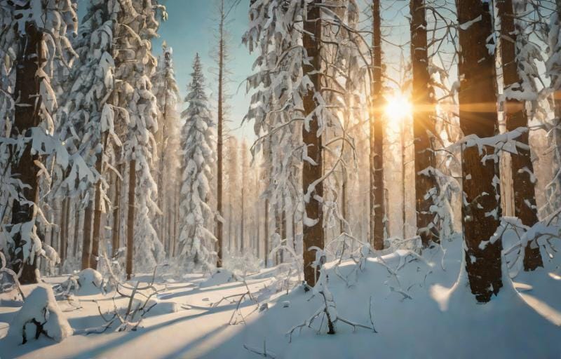 In the deepest winter, among the harshness of the snow-covered forest, a new year sneaks up and over the horizon. The light bounces off the freshly fallen snow, reflecting off thousands of icicles dangling from frozen branches, and casts a blinding white radiance across the quiet landscape.