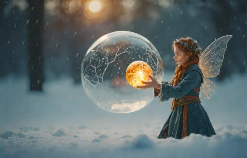 The fairy shivers, pulls her woolen cloak tighter about her shoulders. She crouches down, scoops up one of the dozens of crystal orbs at her feet. She holds it up, admiring it.